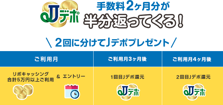 毎月1日~末日までにリボキャッシング※1を合計5万円以上ご利用され、かつエントリーいただくと2ヶ月分※2の利息の半額相当のJデポを皆さまにプレゼント。